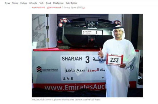 一块号码仅有数字“1”的汽车牌照4日在阿拉伯联合酋长国沙迦一场拍卖会上被商人阿里夫·艾哈迈德·扎鲁尼以1800万迪拉姆(约合3200万元人民币)的价格拿下。扎鲁尼接受《海湾新闻报》采访时说,“我的目标是永远当第一”。拍卖会共拍卖60个车牌号,最火爆的十大车牌号为“12”、“22”、“50”、“100”、“333”、“777”、“1000”、“2016”、“2020”和“99999”。拍卖总成交额达5000万迪拉姆(约合8900万元人民币)。英国《卫报》5日报道,尽管扎鲁尼的出价是那块车牌起拍价的18倍,但它并不是阿联酋最贵的车牌号。2008年2月,阿联酋商人赛义德·加法尔·扈利在首都阿布扎比一场慈善拍卖会上以5220万迪拉姆(按现行汇率约合9329万元人民币)的价格拍得号码为“1”的阿布扎比车牌号。(陈丹)【新华社微特稿】