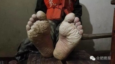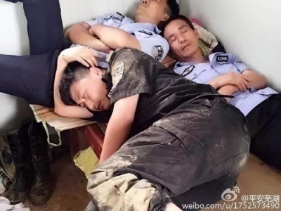 拍照的时刻是7月3日,焦磊在两条板凳上拼凑的“床”上小憩,此时,他的双脚已经在洪水里连续浸泡了19个小时,脱下鞋袜,双脚早已失去肉色,没有了知觉!