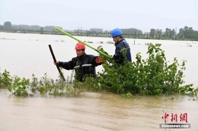 7月4日,安徽六安城郊供电公司的供电抢修队伍,在位于六安市金安区双河镇谢郢村洪水灾害区域,冒雨抢修电路,保障受灾地区电力安全。6月30日以来,安徽中部地区的六安市遭遇连续数日暴雨,位于六安市金安区、舒城县、肥西县交界处的双河镇受灾严重,其中丰乐圩破堤5处,致使该镇1个街道13个村6000余群众受灾转移,60个配电台区水淹受灾。