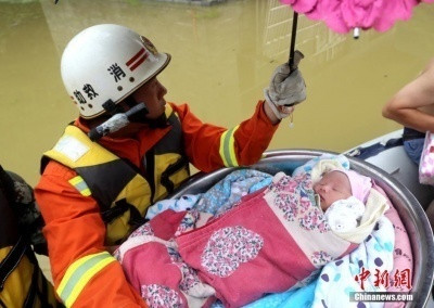 由于连日降雨,贵州沿河县甘溪镇唐边村下坝村民组整个村庄被水淹。6月21日,当地消防部门利用冲锋舟救援一家三口,消防员用一个大水盆装下刚出生10天的婴儿,做好双重保护,而正在坐月子的母亲不能沾水,消防员与其丈夫将其抬上冲锋舟。在冲锋舟上,遮阳伞下,婴儿安然入睡。图为消防将一家三口疏散到安全地带。