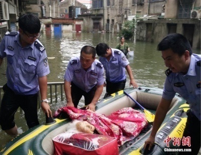7月4日下午,宜兴市公安局官林派出所接到求助,报警人称当地新官东路5号有一位106岁老人行动不便需要救援,因该小区被淹,常规车辆无法驶入接送,遂向警方求助。值班民警余明接到报警后,立即带队携带所里的橡皮艇赶到现场,将老人从楼上抱下,并陪同其家人将她送到位于另一个村庄的儿子家中。据了解,7月1日晚开始,宜兴市普降暴雨,截至当日上午10点,该市平均面雨量达235毫米,由于持续强降雨和高水位,宜兴徐舍、杨巷等区域受淹。